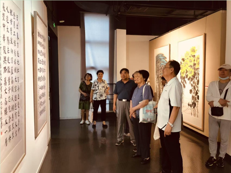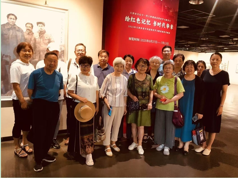 7月8日,我校关工委组织离退休老同志参观“绘红色记忆 书时代华章——天津市老少共话党史学习教育成果书画展”。我校书画班老师随行现场为老同志们做专业指导。